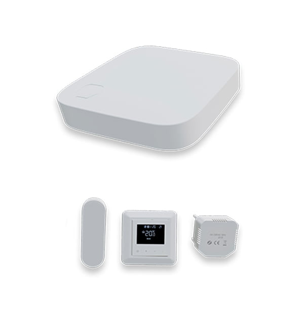 Pakke inneholder; Hub, hansensor, 2 stk termostater til varmekabler i bad og entre, rele for styring av vvbereder og nettverkspunkt fra måler ute i TKS-skap inn i hytte til hansensor.